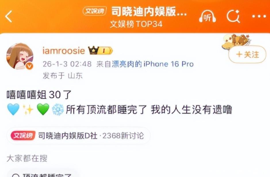 2026年刚开年,内娱的瓜田又疯长了一茬。网红司晓迪一句“30岁前睡遍顶流”,炸得全网哗然。起初大家只当是博流量的疯话,可没过多久,一位素颜出镜的女演员哽咽着揭开拍戏时的遭遇,才让人意识到——这哪是炒作,分明是撕开了遮羞布的一角。